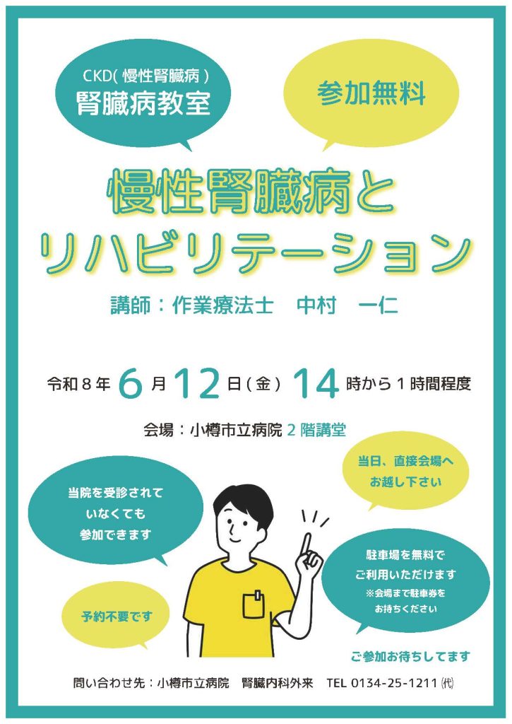腎臓病教室を開催します CKD(慢性腎臓病) 腎臓病教室 慢性腎臓病とリハビリテーション 日時:令和8年6月12日(金) 14時 会場:小樽市立病院2階講堂 当院を受診されていなくても参加できます。 Date:2026年04月16日 Category:お知らせ