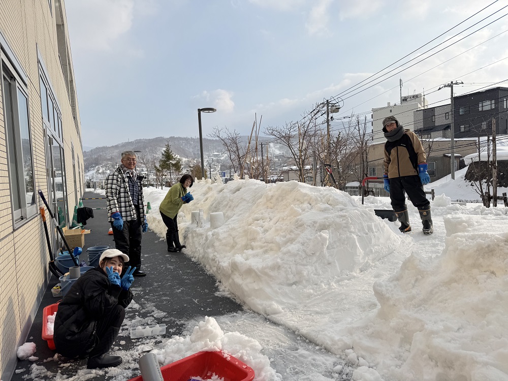 会場づくり後に点灯した初日は天候に恵まれ、キャンドルの灯りがあまり消えることもなく安定していましたが、2日目はつけては消えるを繰り返し、全部が同時についている状態をキープするのが難しい状況でしたが、院内放送を流すと、入院患者さんがたくさんお越しになり、窓越しの雪あかりを楽しまれました。 以前にワックスボウルを作成したという方や、雪あかり会場でお手伝いをされた方などは当時を懐かしまれている様子で「病院で雪あかりを見られると思わなかったので嬉しい、リフレッシュできました」との感想が聞かれました。