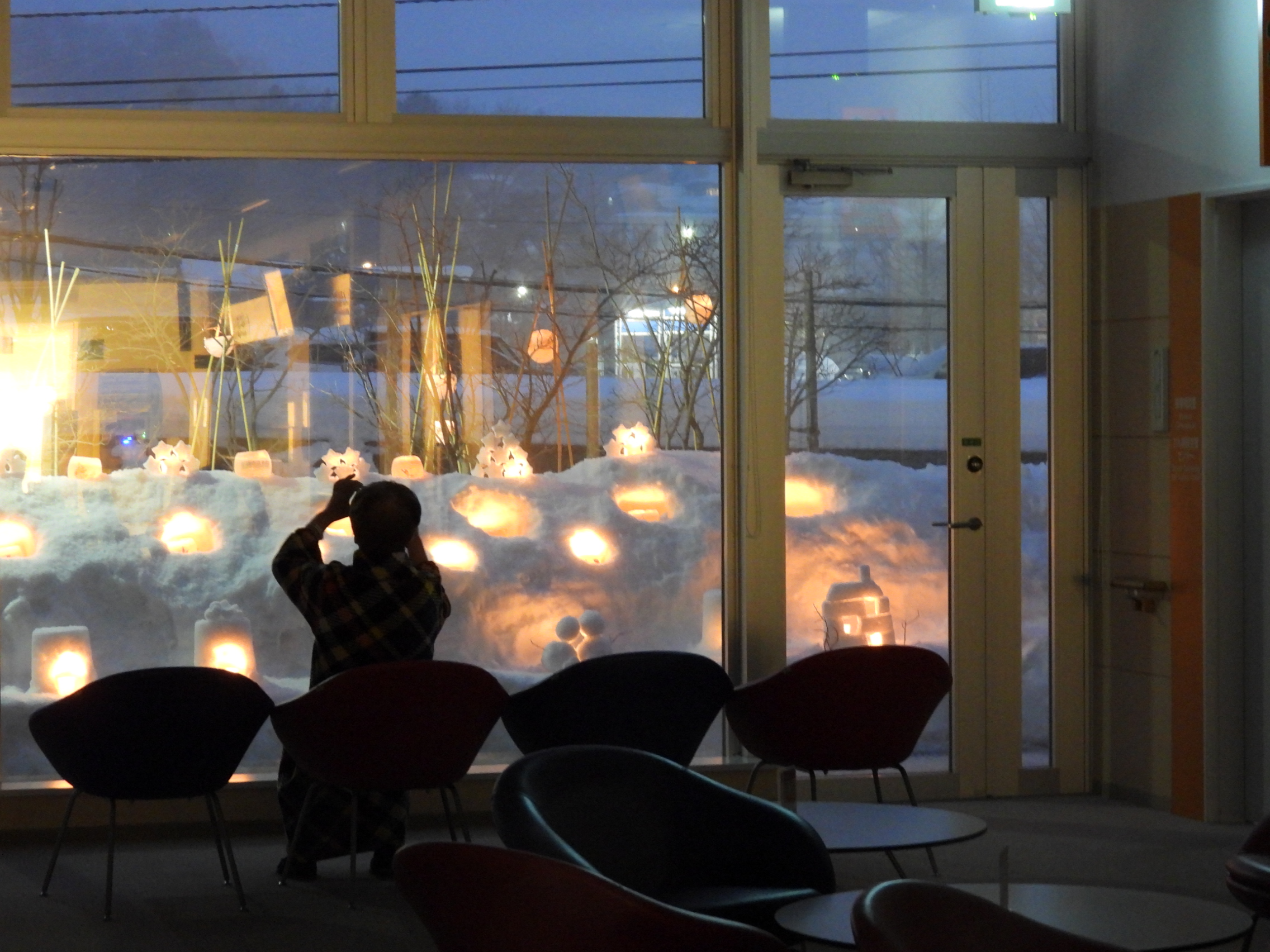 会場づくり後に点灯した初日は天候に恵まれ、キャンドルの灯りがあまり消えることもなく安定していましたが、2日目はつけては消えるを繰り返し、全部が同時についている状態をキープするのが難しい状況でしたが、院内放送を流すと、入院患者さんがたくさんお越しになり、窓越しの雪あかりを楽しまれました。 以前にワックスボウルを作成したという方や、雪あかり会場でお手伝いをされた方などは当時を懐かしまれている様子で「病院で雪あかりを見られると思わなかったので嬉しい、リフレッシュできました」との感想が聞かれました。
