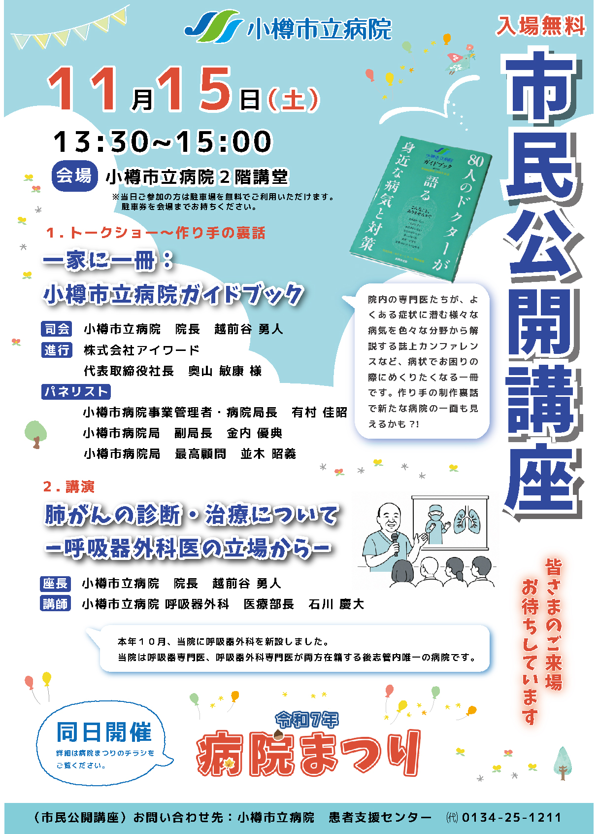 会場:小樽市立病院2階講堂 ※当日ご参加の方は駐車場を無料でご利用いただけます。駐車券を会場までお持ちください。