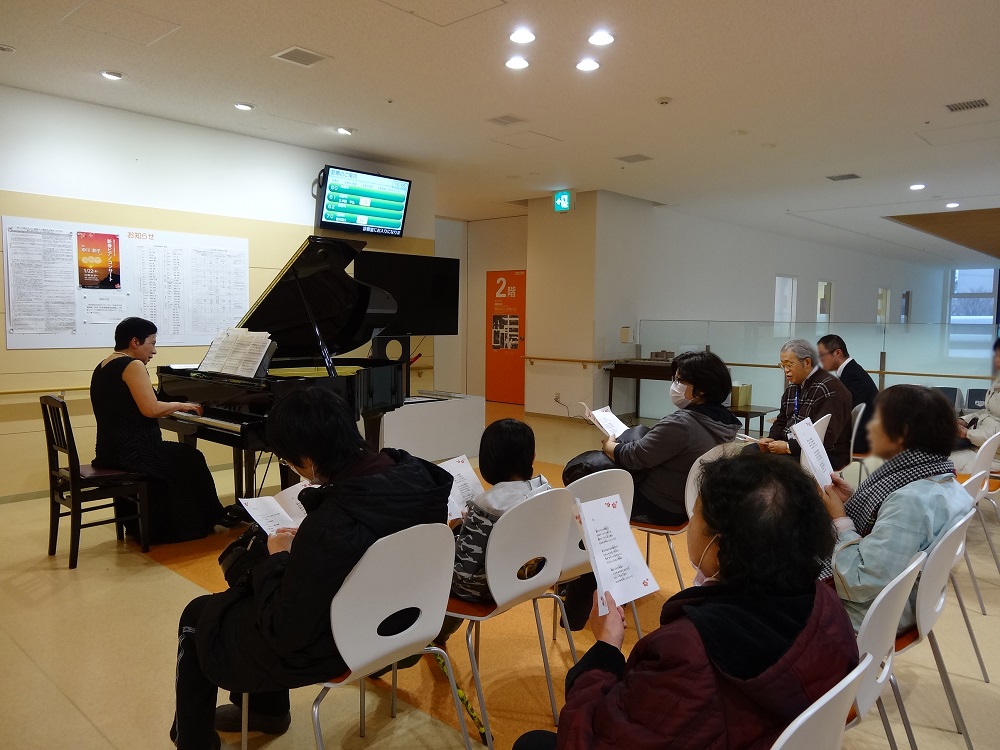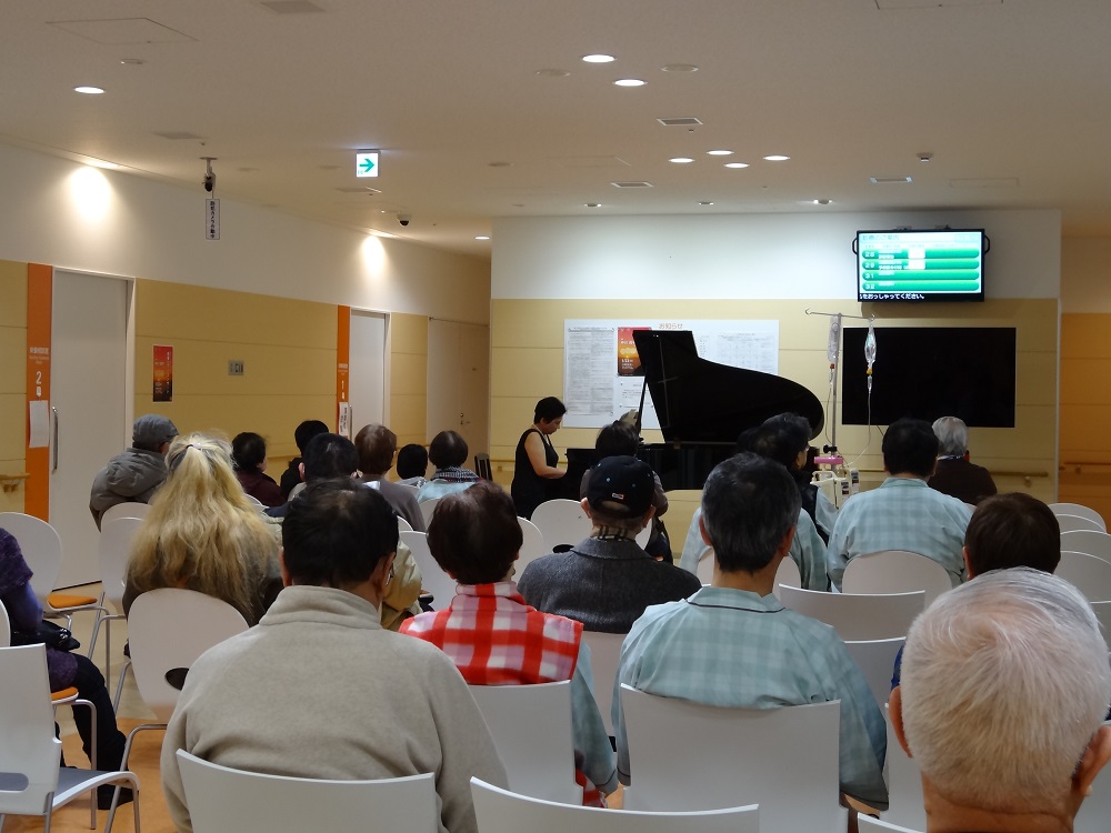 ベートーヴェン、モーツァルト、ショパンをはじめとするクラッシックの他、来場者の皆さんが合唱できるよう瀧廉太郎の名曲「花」を演奏していただき、入院中でなかなか歌う機会のない患者さんたちも、歌詞の書かれたプログラムを手に一緒に声を出されていました。