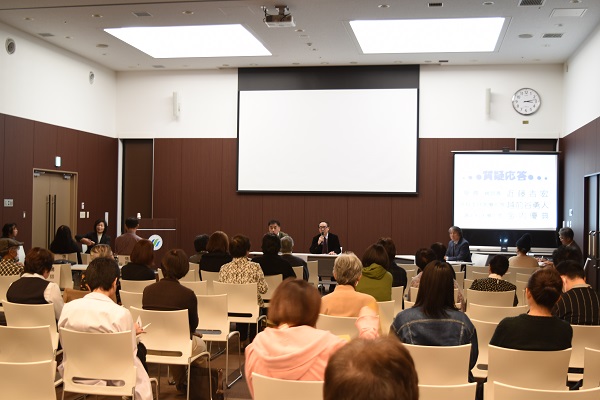 午後1時30分からの市民公開講座「女性に多いがんを知る講演会」は外科医師による「乳がんについて」、婦人科医師による「婦人科のがんを知りましょう」の2つの演題で行われました。講演後の質疑応答も時間を超過するほどの関心の高さが伺えました。