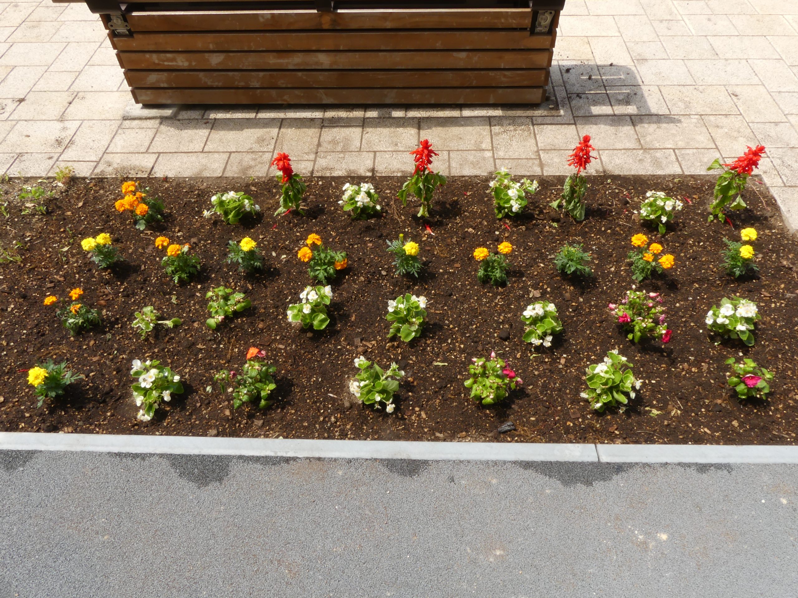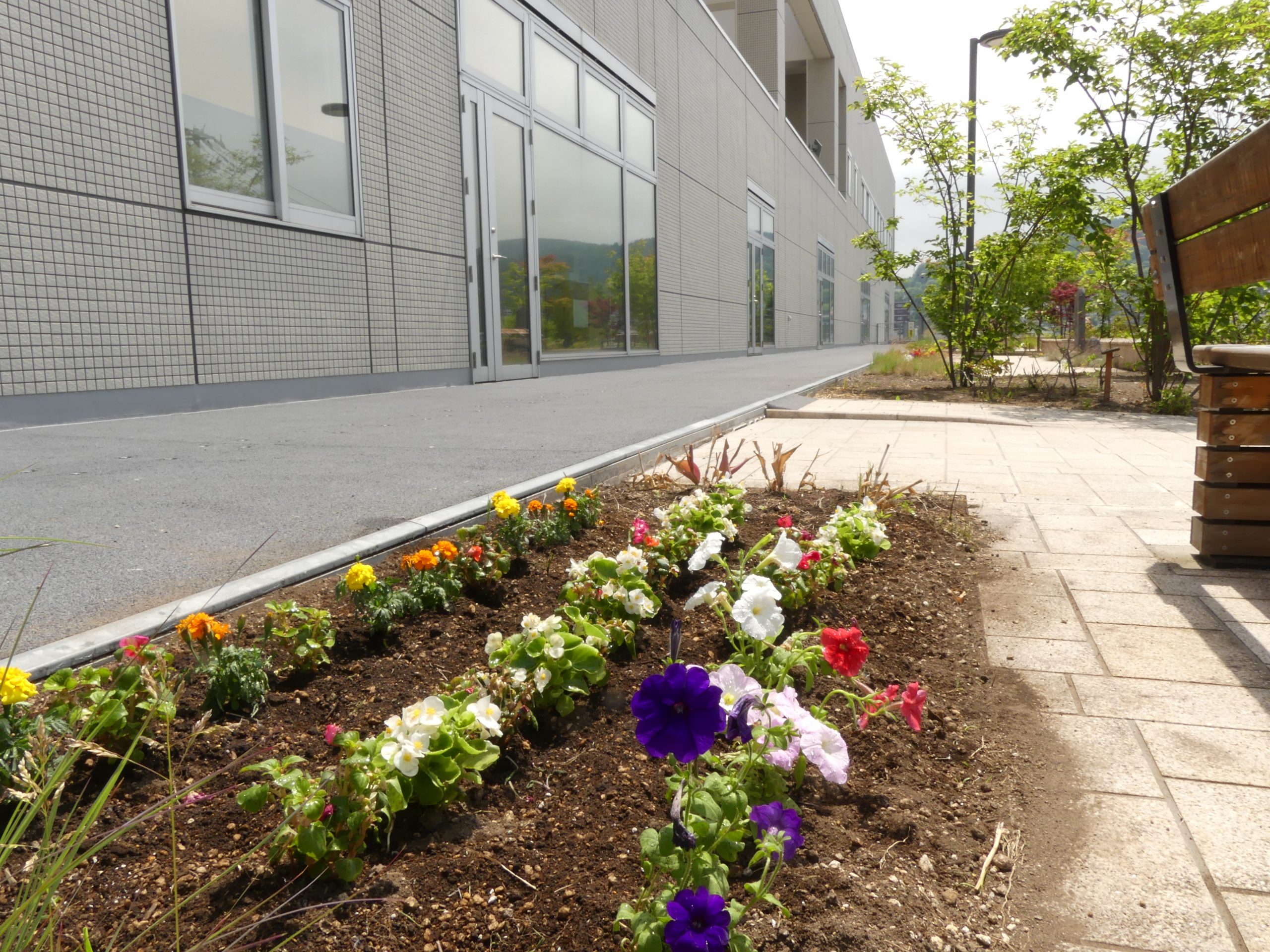 当院玄関横の量徳小学校メモリアルガーデンにポット花の植え込みを行いました。