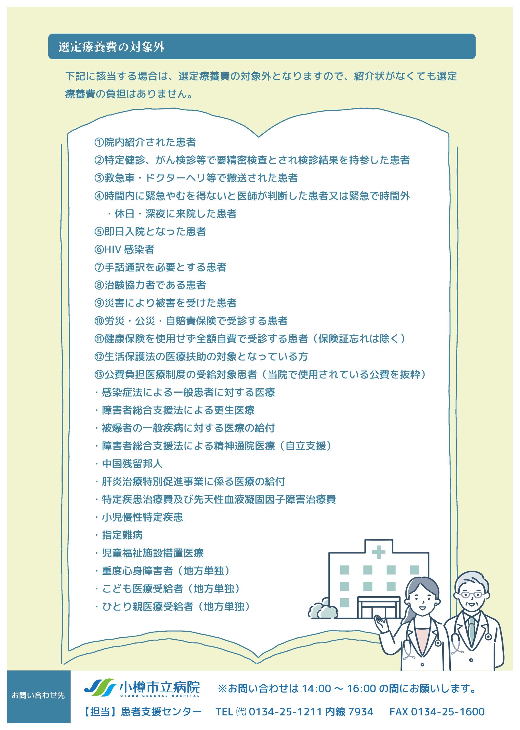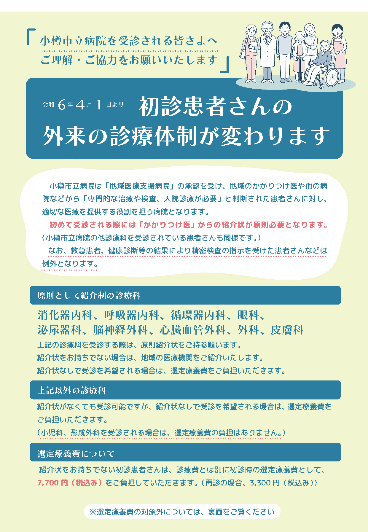 当院は、北海道知事から後志管内で初の「地域医療支援病院」に承認されました。これにより、令和6年4月1日からは、当院に初めて受診される際には「かかりつけ医」からの紹介状が必要となります。また、救急患者や健康診断の結果により精密検査の指示を受けた患者などの例外(別表参照)を除き、紹介状をお持ちでない患者は選定療養費として7700円(税込み)の負担が発生します。 この変更は、外来、入院、手術等の待ち時間を短縮し、必要な時に必要な医療を迅速に提供するための取り組みですので、ご理解、ご協力をお願いいたします。