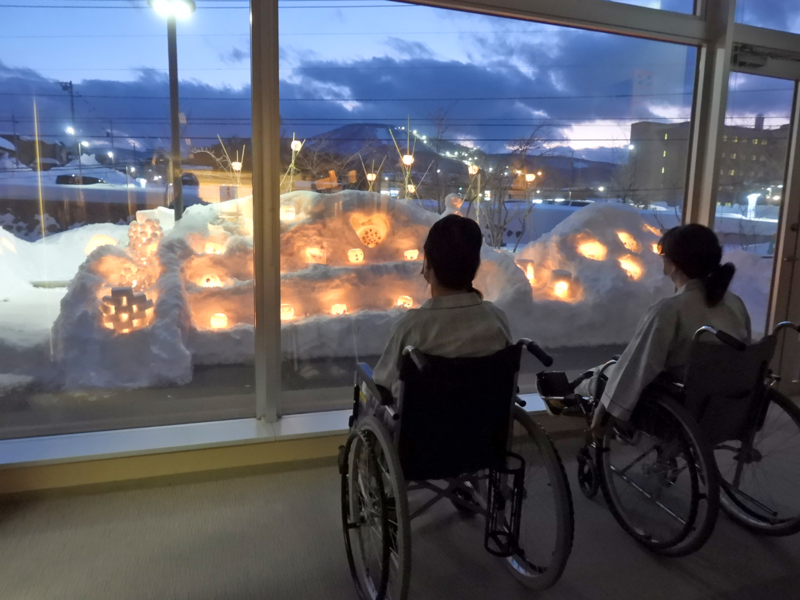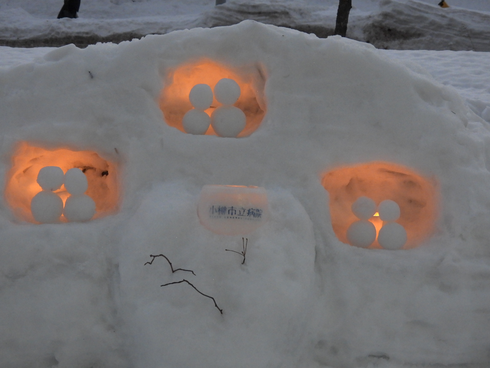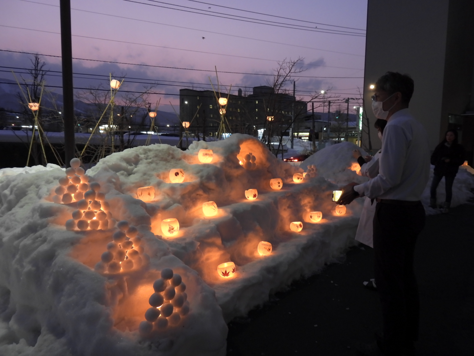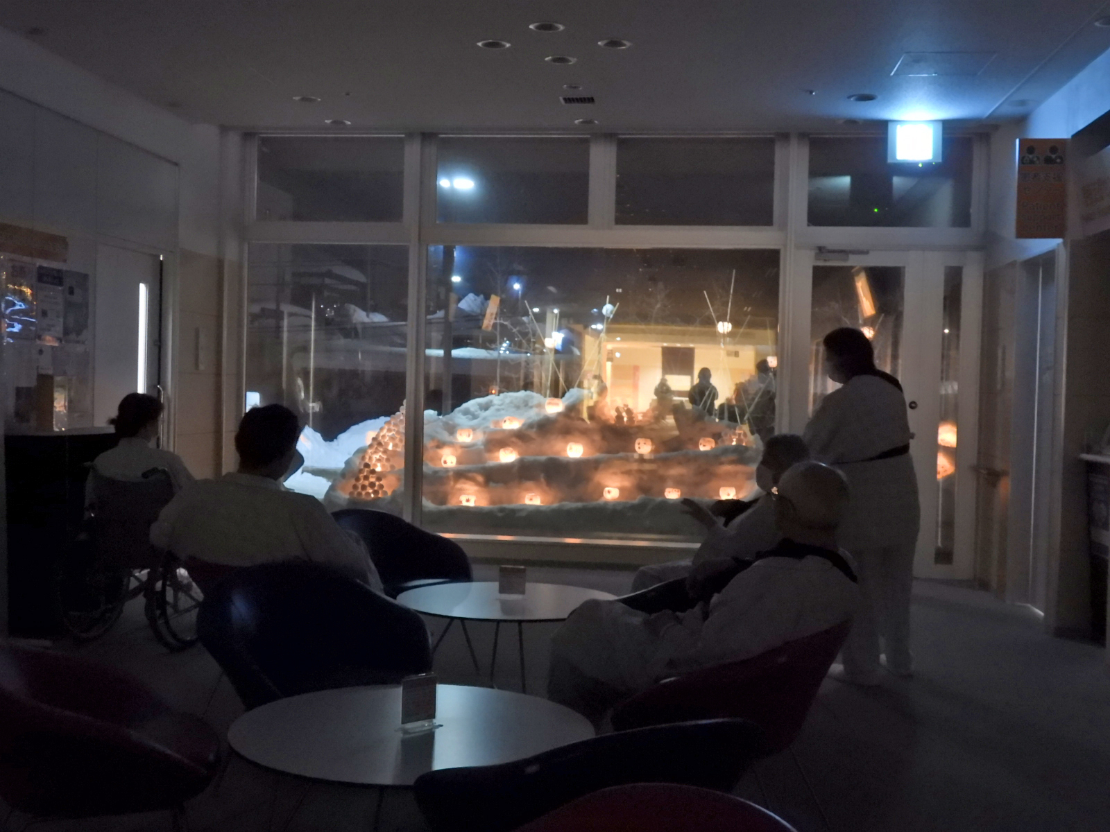病院職員が作成したコーナーは、1階患者支援センター前の窓からも見えるので、入院患者さんたちも多くご来場され「何個かある程度だろうと思って来てみたら、すごい大がかりで綺麗でびっくりした。」、「灯りに癒される。」など、感想を言ってくださいました。 開催2日目は暖気の影響で前日の造作が半分以上融けてしまいましたが、短時間で作り直し、無事に点灯し連日来られた方にも無事に見ていただくことができました。