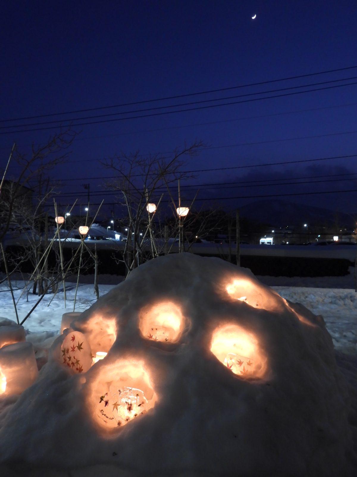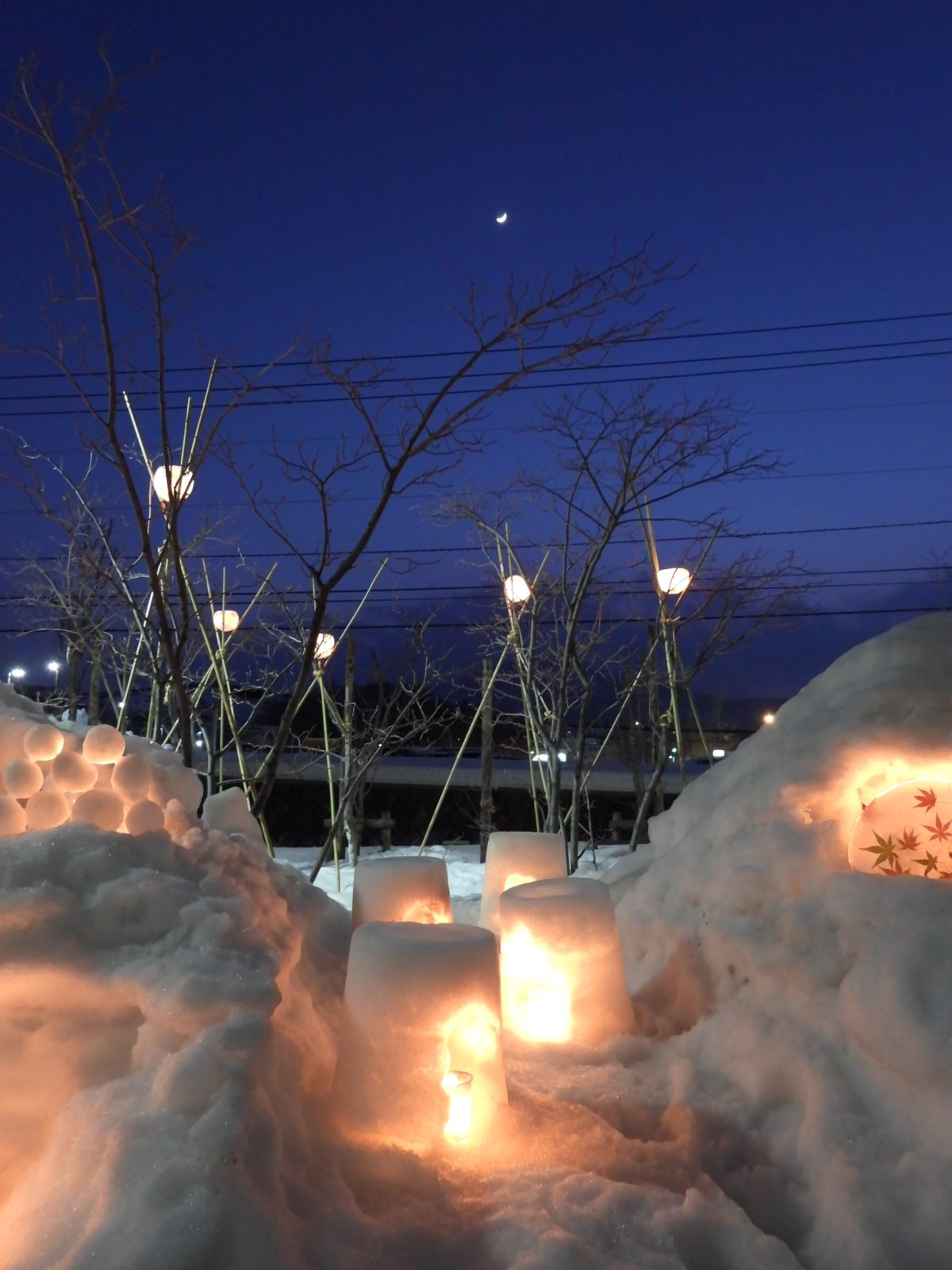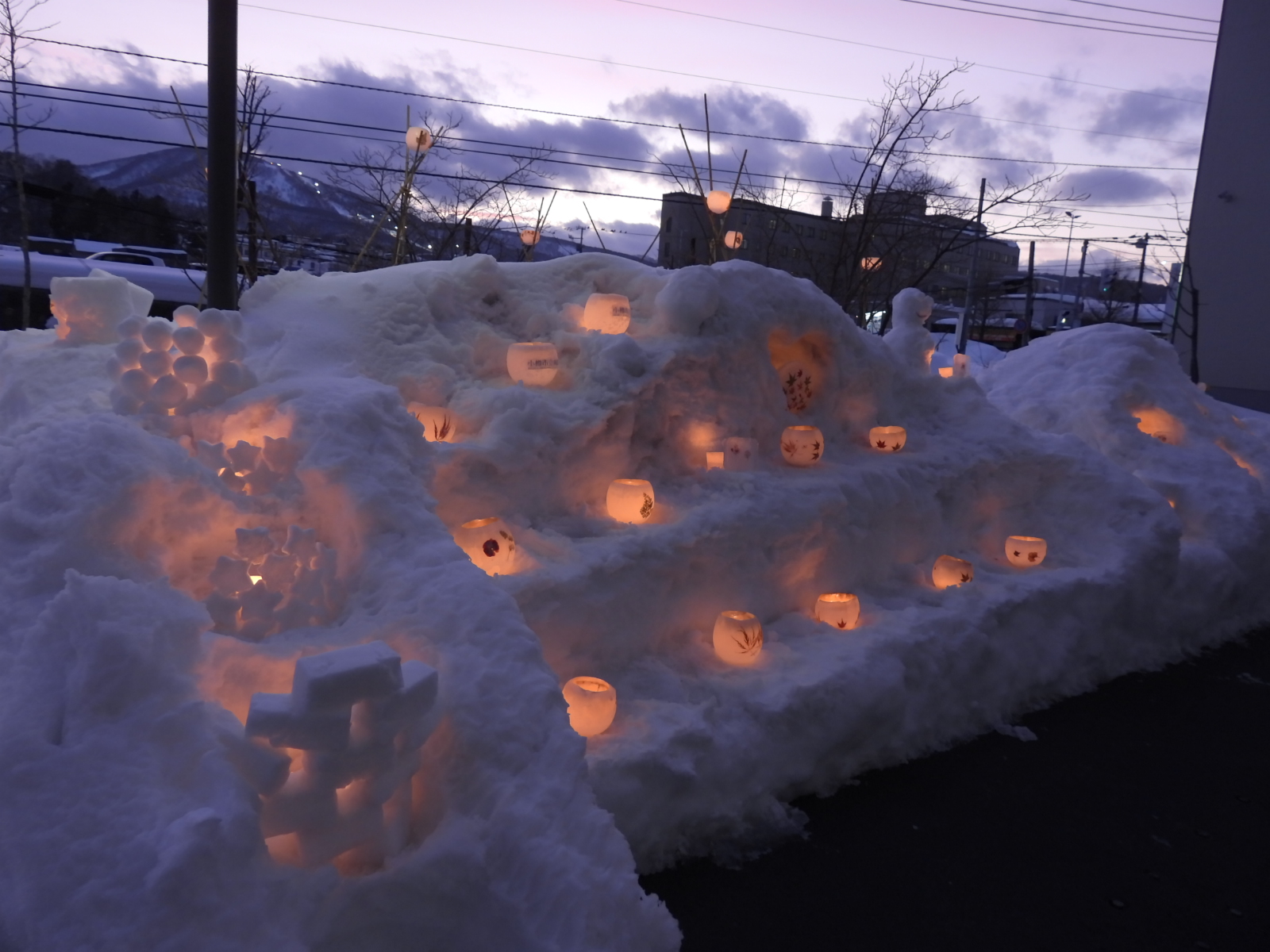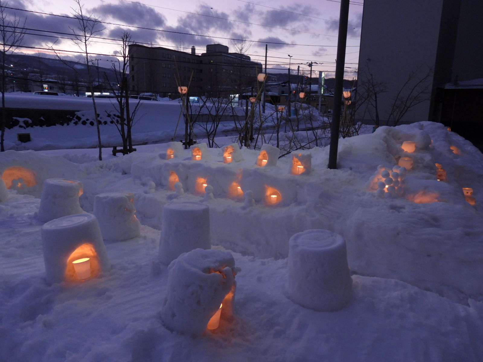 病院職員が作成したコーナーは、1階患者支援センター前の窓からも見えるので、入院患者さんたちも多くご来場され「何個かある程度だろうと思って来てみたら、すごい大がかりで綺麗でびっくりした。」、「灯りに癒される。」など、感想を言ってくださいました。 開催2日目は暖気の影響で前日の造作が半分以上融けてしまいましたが、短時間で作り直し、無事に点灯し連日来られた方にも無事に見ていただくことができました。