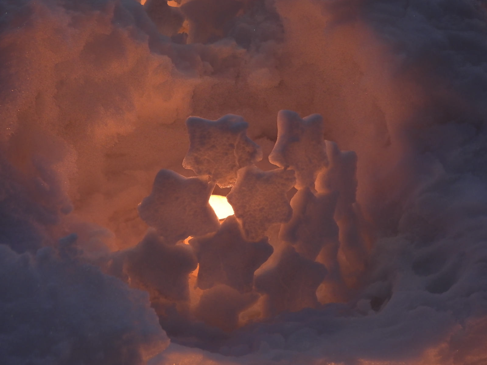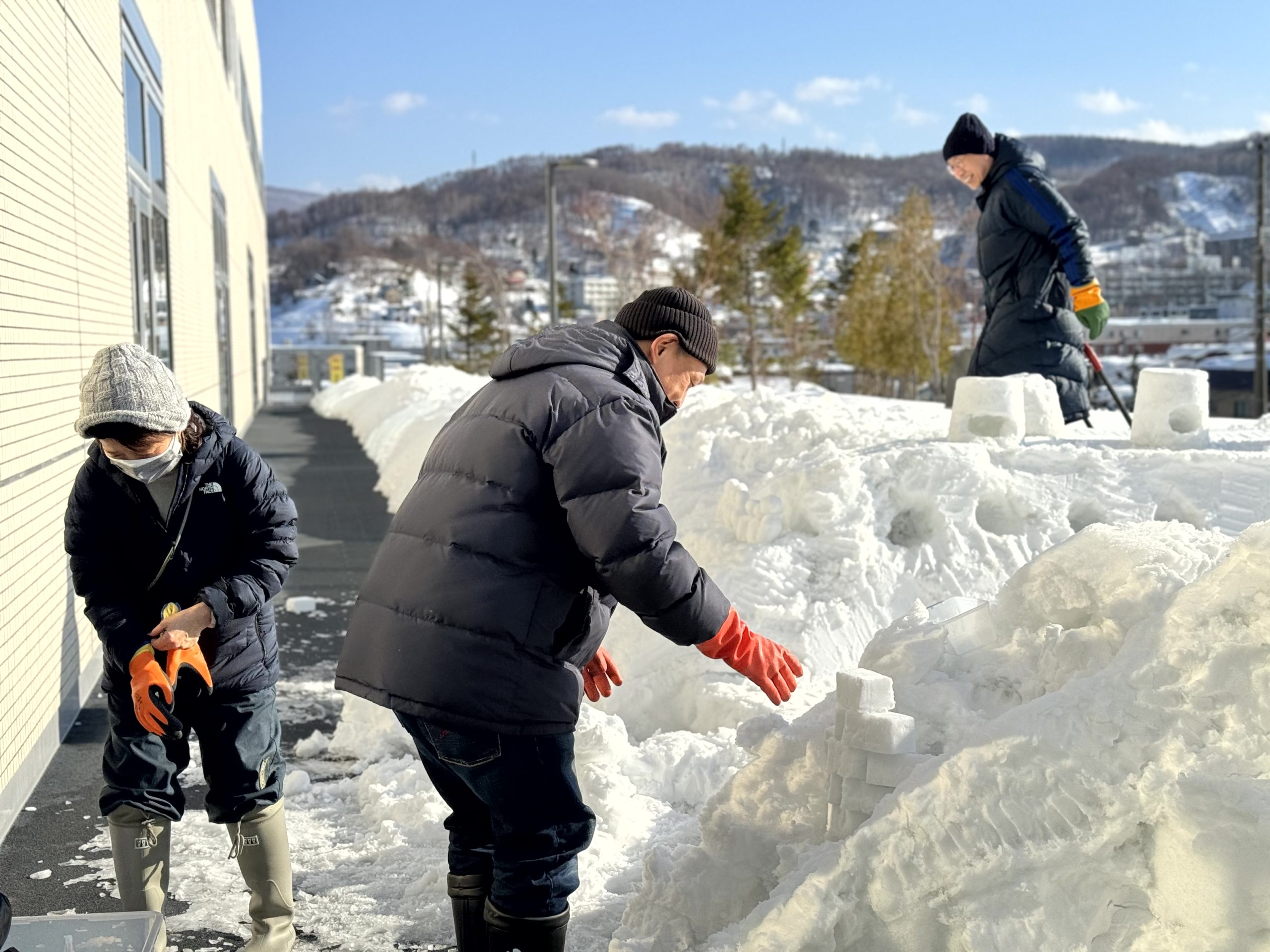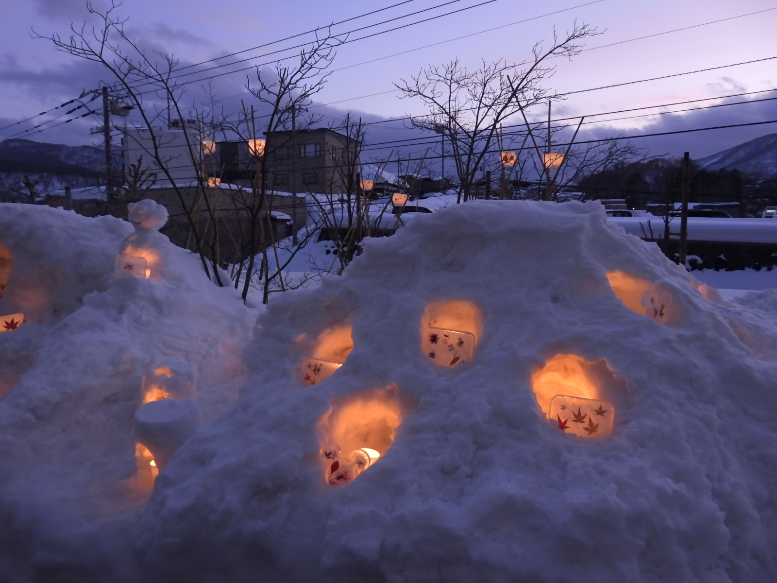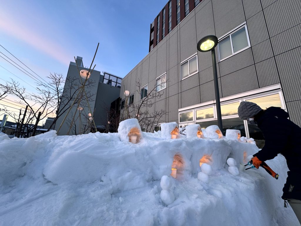 病院職員が作成したコーナーは、1階患者支援センター前の窓からも見えるので、入院患者さんたちも多くご来場され「何個かある程度だろうと思って来てみたら、すごい大がかりで綺麗でびっくりした。」、「灯りに癒される。」など、感想を言ってくださいました。 開催2日目は暖気の影響で前日の造作が半分以上融けてしまいましたが、短時間で作り直し、無事に点灯し連日来られた方にも無事に見ていただくことができました。