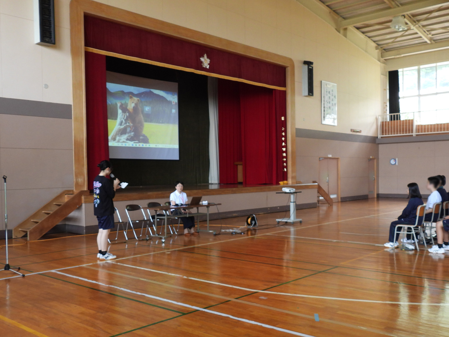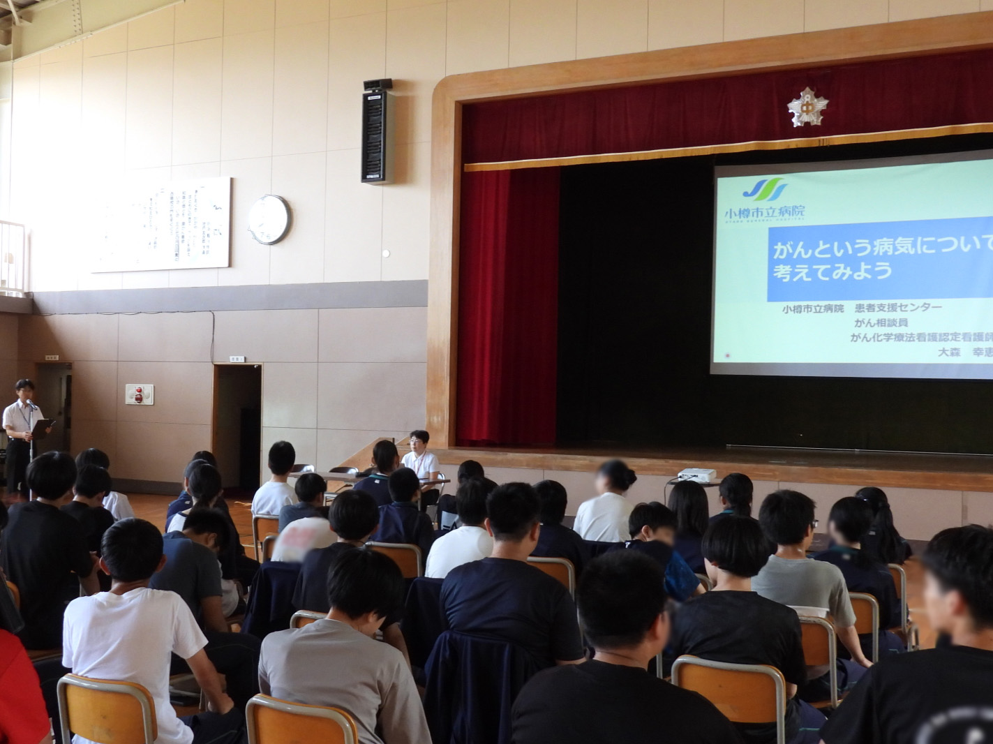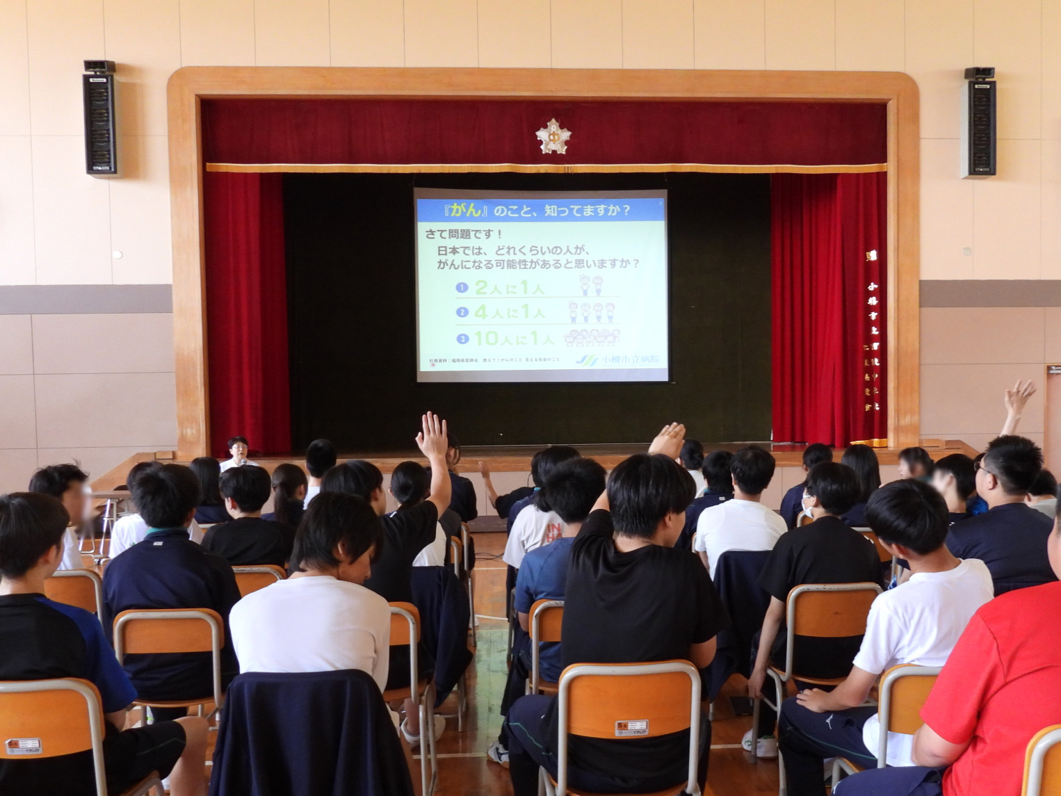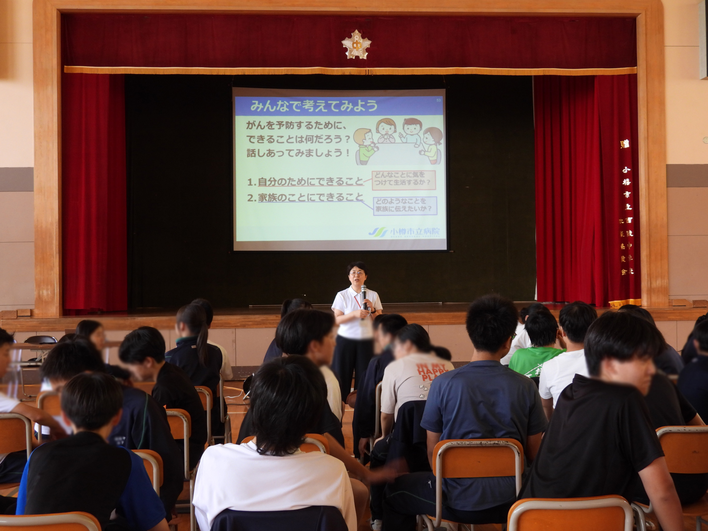 当日、小樽市の最高気温は29度超で、会場となった体育館はさらに暑い中でしたが、参加した2年生は熱心に耳を傾けていました。「がんの予防について、自分のためにできること、家族のためにできることをみんなで考えてみよう」という講師の提案に周りの席の人たちと話し合いました。