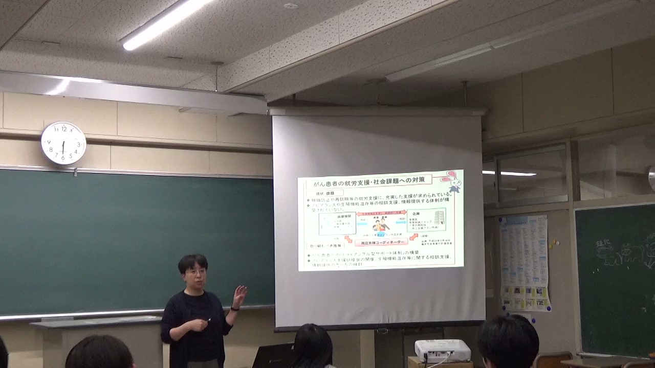 講話の内容は、がんについての知識、治療や治療と仕事の両立支援、緩和ケアに関すること、がん相談支援の実際についてのほか、事前に生徒から送られてきたがんに関する質問にも応じました。