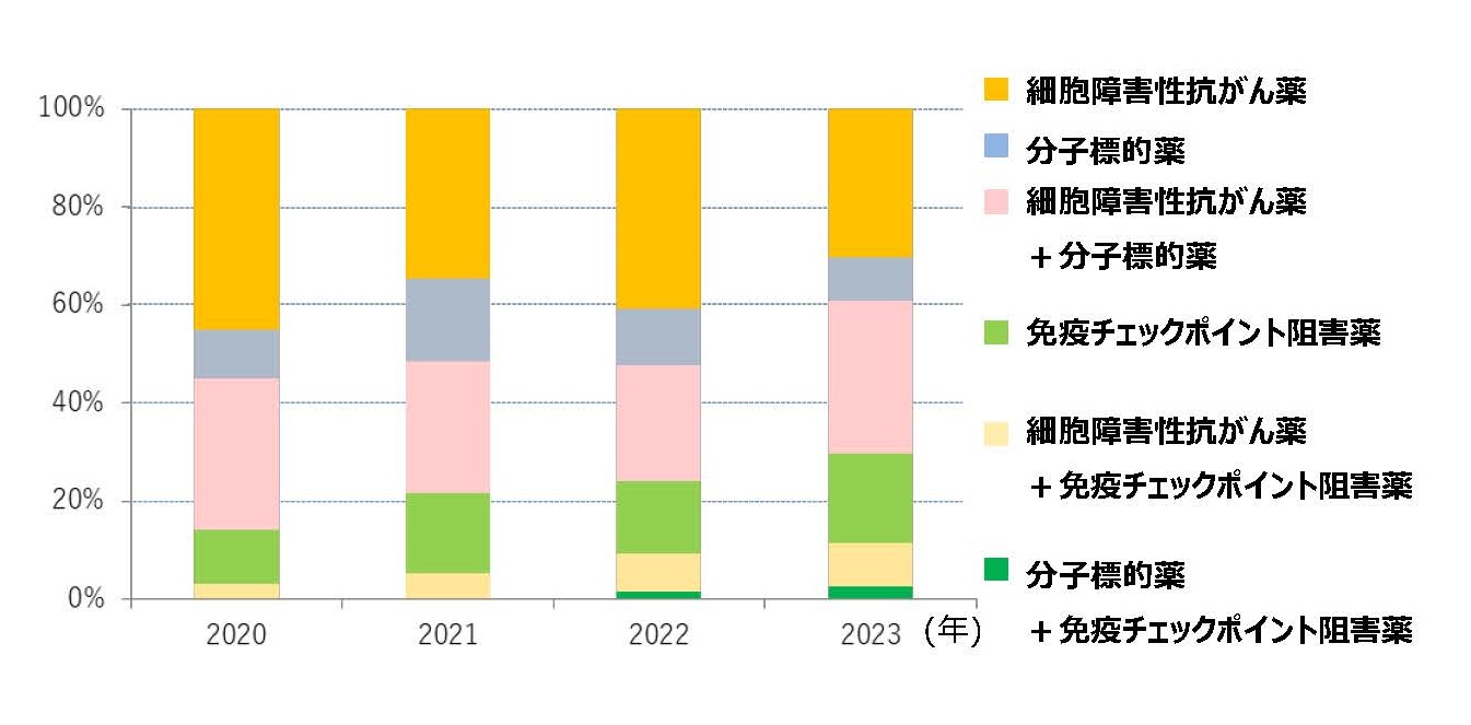 従来から使用されていた細胞障害性抗がん薬の使用割合は減少傾向、近年様々ながんに使用できるようになった免疫チェックポイント阻害薬(免疫療法)を併用あるいは単独使用の割合が増加傾向です。