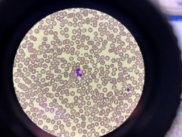 血液疾患(貧血・造血器腫瘍など)の診断、治療効果判定や貧血、感染症などを調べるために血球算定、形態学的検査などを行っています。血液を顕微鏡で観察し、自動分析測定装置では分類する事が出来ない細胞を分類する事で、血液疾患を鑑別する為の判断材料にもなっています。