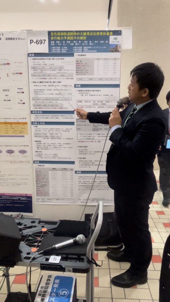 - 遠藤 智康 (医療技術部リハビリテーション科) 一般演題 口演 「当院における大腿骨近位部骨折患者の転院時歩行可否に影響を与える 術直後因子についての検討」