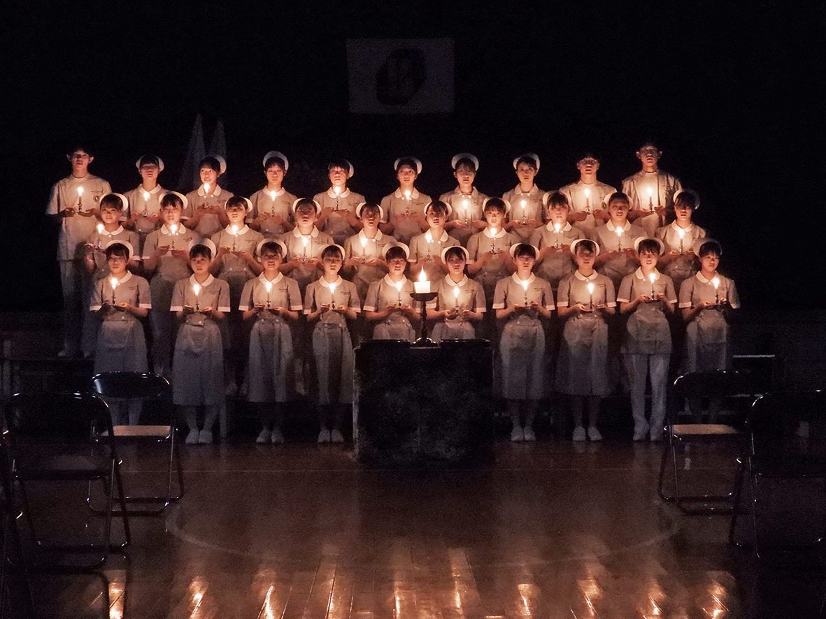 今年、戴帽を受けた30名の学生たちはキャンドルサービスの灯りの下でナイチンゲール誓詞を唱え、看護師への決意を胸に新たな一歩を踏み出しました。 12月から医療現場での実習が始まります。