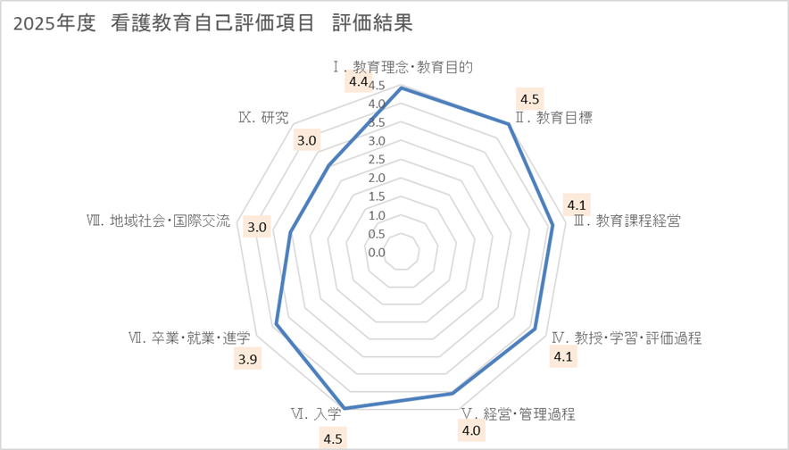 平成14年3月の「専修学校設置基準」の改正により、専修学校は教育活動等の状況について自己点検および自己評価を行い、その結果を公表するよう努めなければならないと定められました。また、平成23年3月には「看護師等養成所の運営に関する指導要領」の改定により、養成所は教育活動その他の養成所運営の状況について、自ら評価を行い、その結果を公表することとなりました。そこで当校においても厚生労働省の指針である「看護教育自己評価指針」評価一覧を基に、自己点検・自己評価を行っています。北海道看護教育施設協議会で作成した評価表(教育活動を対象とした9カテゴリー)を使用し、在職している教員に対して実施しました。回答率は100%で、カテゴリーごとに平均値を図示したものを以下に示します。